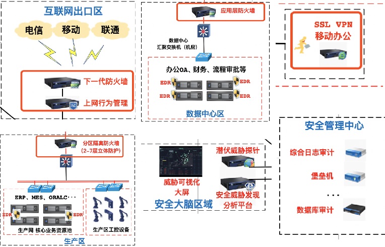 安全域劃分:集團網(wǎng)絡(luò)劃分成辦公網(wǎng)、研發(fā)網(wǎng)、生產(chǎn)網(wǎng),數(shù)據(jù)中心網(wǎng),通過下一代防火墻實現(xiàn)網(wǎng)絡(luò)的邏輯隔離和安全防護。