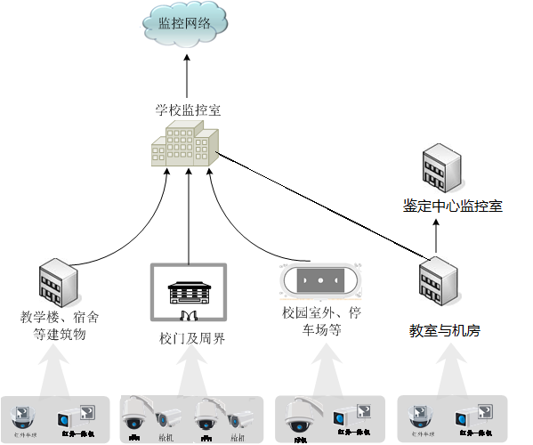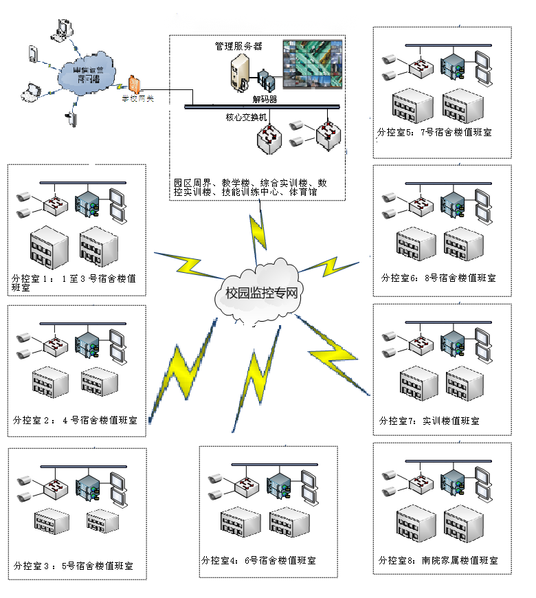 (1)分校區(qū)現(xiàn)有的監(jiān)控點遍布學校各個重要點位,包括教學樓、一體化樓、實訓樓、辦公樓、學生宿舍、學生食堂、校內(nèi)重要場所等。通過光纖鏈路將前端各個點位匯聚到監(jiān)控中心,并統(tǒng)一傳到監(jiān)控中心集中存儲。
